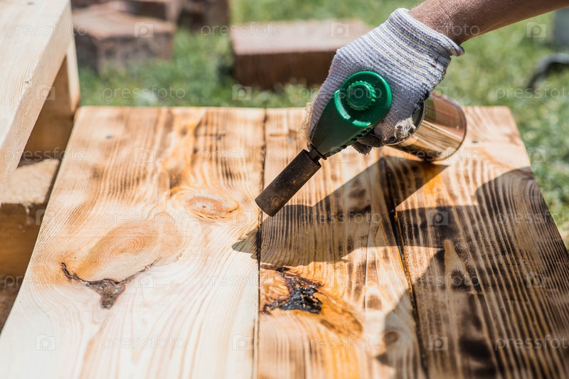 Текстура древесины обрабатывается на огне с помощью горелки.Процесс сжигания деревянных досок.Закрыть