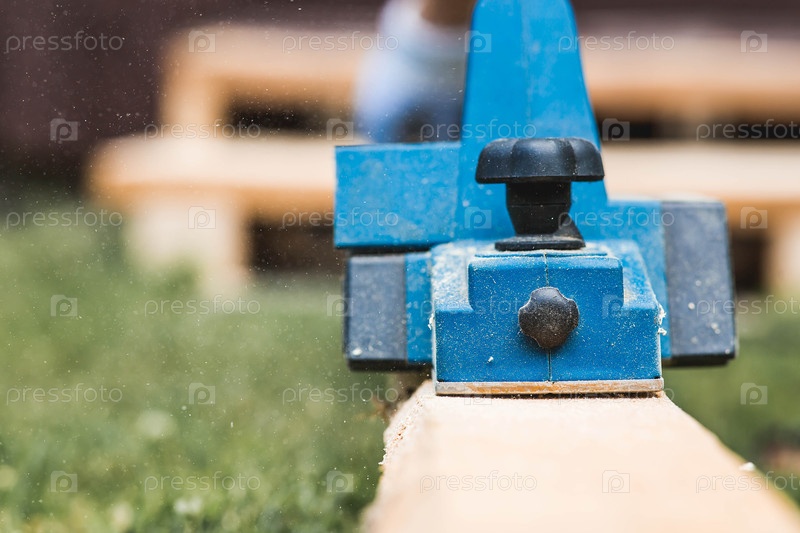 Использование ручной электрической ленты для обработки деревянной доски. Производство древесных изделий. Строительство, обработка древесины
