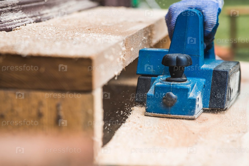 Использование ручной электрической ленты для обработки деревянной доски. Производство древесных изделий. Строительство, обработка древесины