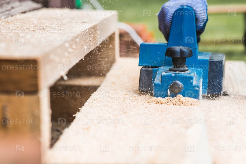 Использование ручной электрической ленты для обработки деревянной доски. Производство древесных изделий. Строительство, обработка древесины