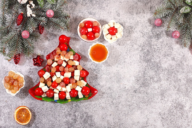 Рождественские и новогодние блюда, традиционный праздничный салат в виде рождественской елки с сыром фета, помидорами, виноградом, оливками и медом с ветвями елейных деревьев и ювелирными украшениями, идея оформления посуды