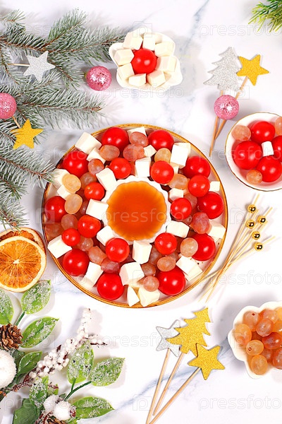 Праздничный новогодний салат с сыром фета, помидорами, виноградом, оливками и медом с ветвями пихты и декорациями, идея украшения блюд, рождественские и новогодние блюда, шаблон меню и баннер