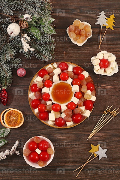 Традиционный праздничный салат с сыром фета, помидорами, виноградом, оливками и медом с ветвями пихты и декорациями, идея украшения блюд, рождественские и новогодние блюда, шаблон меню и баннер