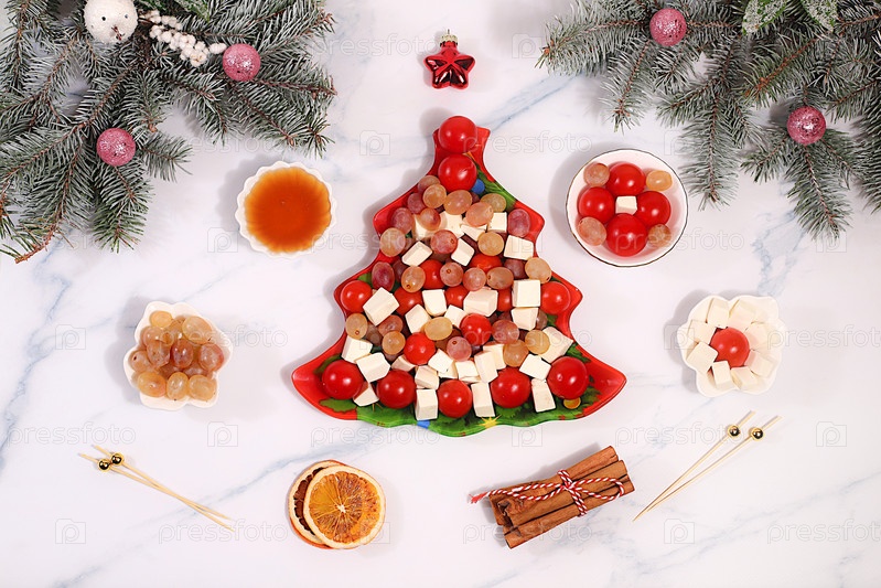 Праздничный новый ежегодный салат в форме дерева с сыром фета, помидорами, виноградом, оливками и медом, покрытым ветвями пихты и орнаментами. Идея дизайна. Рождественские и новогодние блюда, шаблон меню