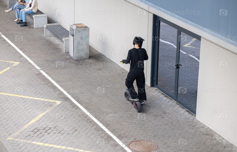 Мужчина в черном костюме и шлеме едет на электрическом скутере по мощеному городскому участку с сидящими местами и стеклянными дверями на заднем плане, демонстрируя современный альтернативный транспорт