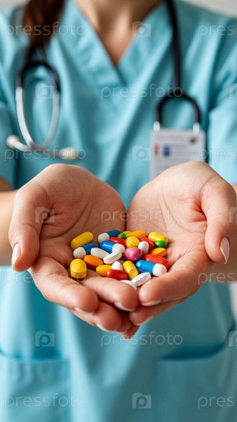 Медицинский работник протягивает в ладоши горсть различных препаратов