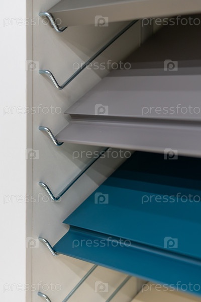 Близкий взгляд на образцы фасадов кухонной мебели на выставочной стойке, показывающий современную матовую отделку в приглушенном сером и ярко-синем цветах для выбора дизайна интерьера