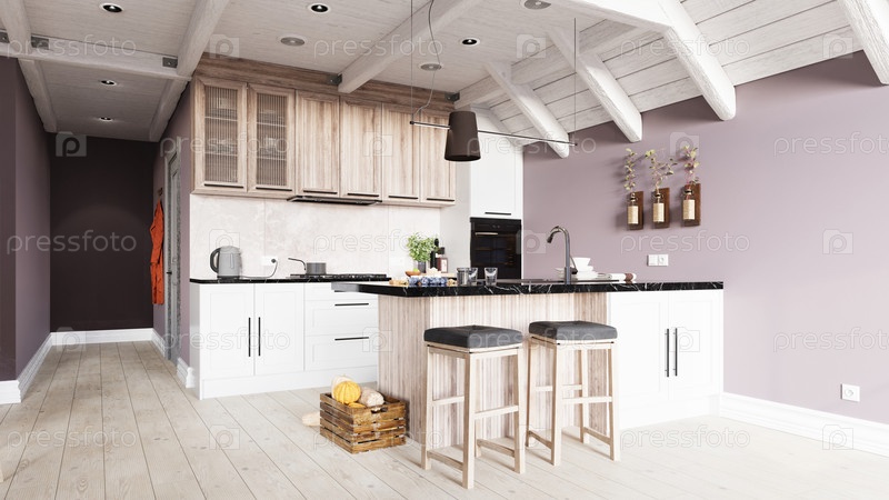 Современный кухонный интерьер с деревянными элементами и сводчатым потолком.Современный дизайн дома с островком кухни и завтраковым баром.Квартира жилой и недвижимости фоном