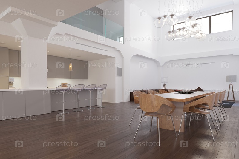 Современный интерьер квартиры с открытым планом. Просторная столовая и кухня с современной мебелью. Роскошная недвижимость и концепция дизайна дома