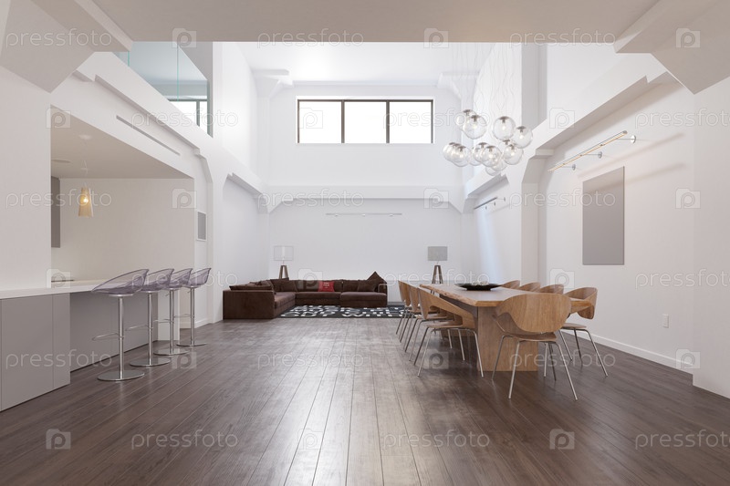 Современный интерьер просторной лофт-квартиры с открытой планировкой гостиной и столовой.Современный дизайн дома с высокими потолками и деревянными полами. 3d rendering