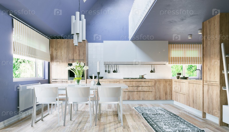 Современная внутренняя кухня и столовая с голубыми стенами.Современный домашний декор со светлыми деревянными шкафами и белыми мебелью. 3D Real Estate Rendering Background