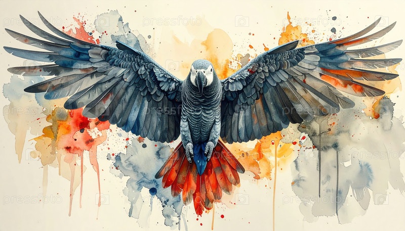 Акварельная живопись попугая, раскрывающего крылья над красочными пятнами, символизирующими свободу, творчество и самовыражение через искусство