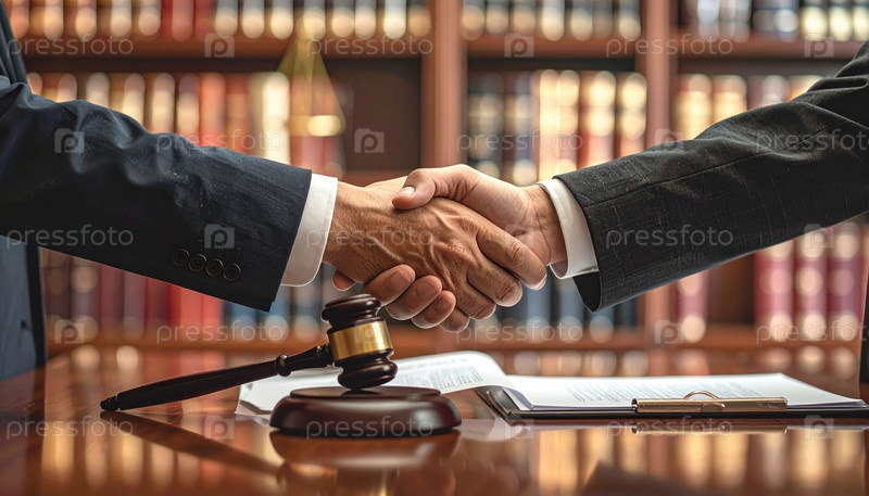 Два бизнес-профессионала пожимают друг другу руки в юридической конторе, символизируя успешные переговоры, партнерство или урегулирование в формальной правовой среде