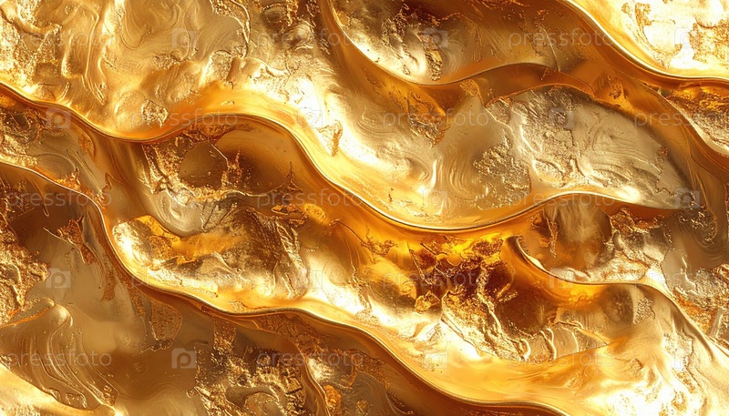 Золотые жидкие волны с светящимися выделениями создают роскошную абстрактную текстуру, представляющую богатство, процветание и премиальную эстетику, используемую в брендинге, искусстве и современных дизайнерских концепциях