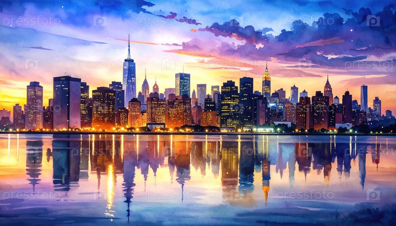 Городской горизонт на закате солнца отражается в спокойной воде, символизируя городскую красоту, современный образ жизни и баланс между природой и архитектурой