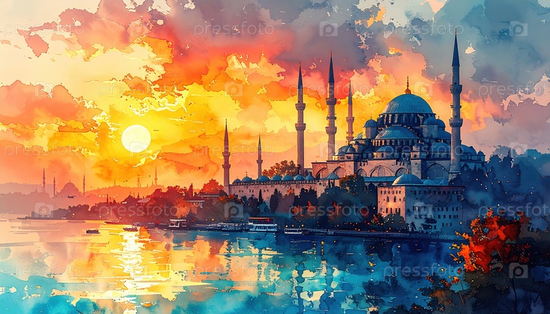 Голубая мечеть на закате над горизонтом Стамбула, отражающая золотой свет Босфора, символизирующий культурное наследие Турции, духовность и вечную красоту