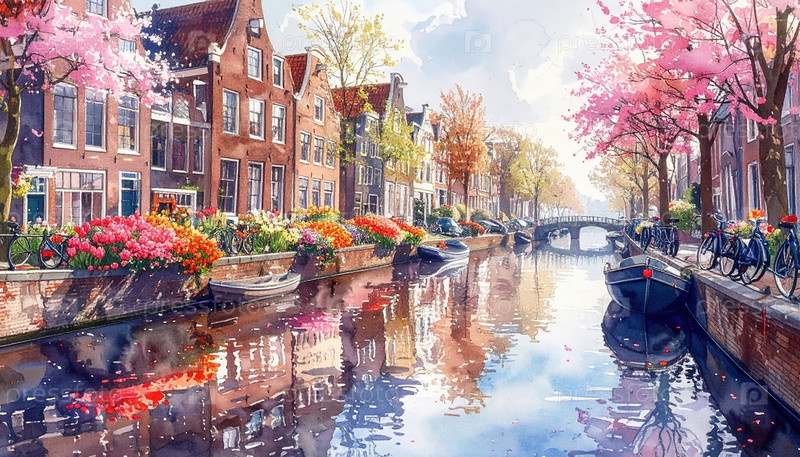 Живописный канал, облицованный тюльпанами и велосипедами весной, представляет собой голландское очарование и вдохновение для путешествий по ярким городским пейзажам