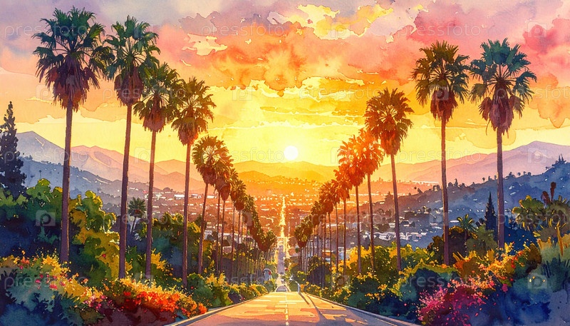 Красочный бульвар пальмовых деревьев на закате солнца окрашен в теплые тона акварели, символизирующие калифорнийский образ жизни, летние путешествия и сонный отдых