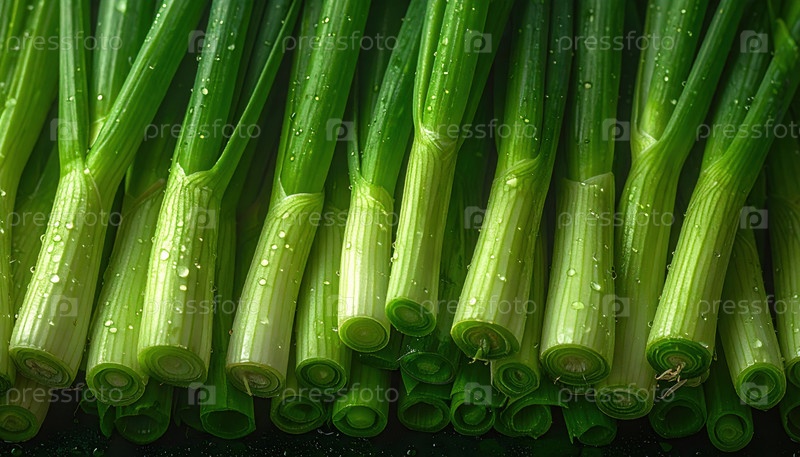 Свежие зеленые луки с капельками воды, расположенными в соответствии с узором, символизируют свежесть, органическую пищу, здоровый образ жизни и перемещение продуктов питания от фермы к столу
