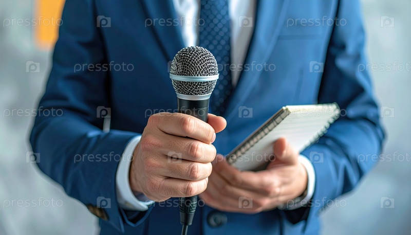 Журналист в костюме с микрофоном и блокнотом, символизирующим целостность СМИ, коммуникации и профессиональной отчетности в современную информационную эпоху