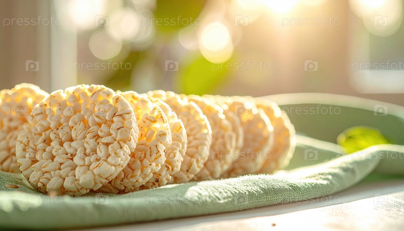 Хрустящие рисовые торты, сложенные на мягкой ткани с утренним солнечным светом, символизируют здоровье, питание и естественные тенденции в еде, которые способствуют осознанному питанию и простоте