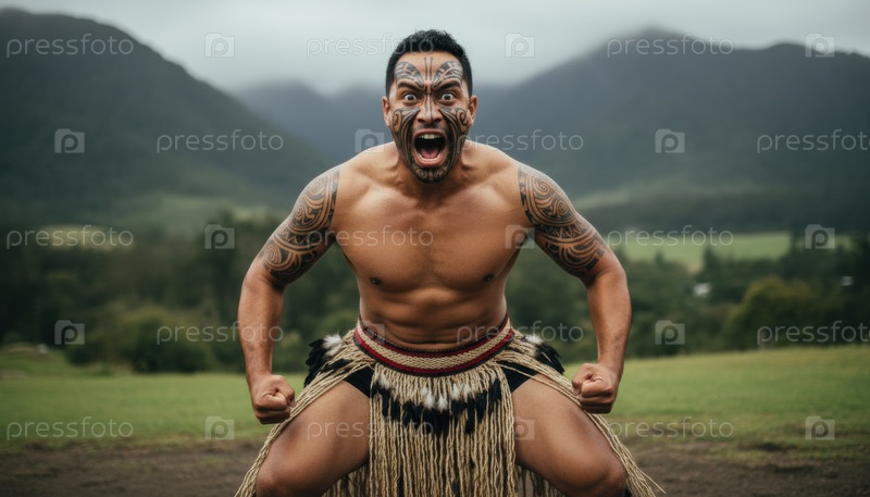 Воин-маори исполняет традиционный танец хака в горах, выражая гордость и наследие
