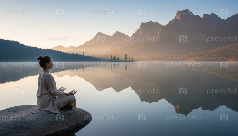 Женщина, медитирующая у тихого горного озера на рассвете, символизирует баланс сознания и связь с природой во время спокойного утреннего отдыха в живописной пустыне