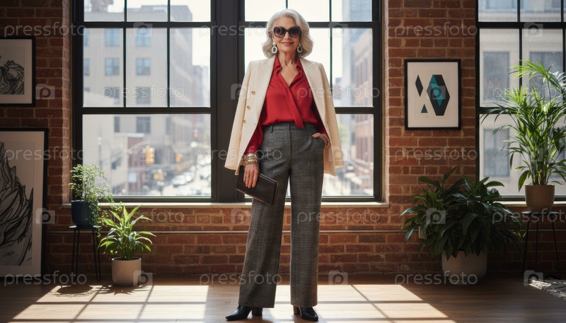 Стильная пожилая женщина в элегантном наряде, уверенно стоящая на современном лофте, символизирующая вневременную моду, расширение возможностей и изощренность в любом возрасте