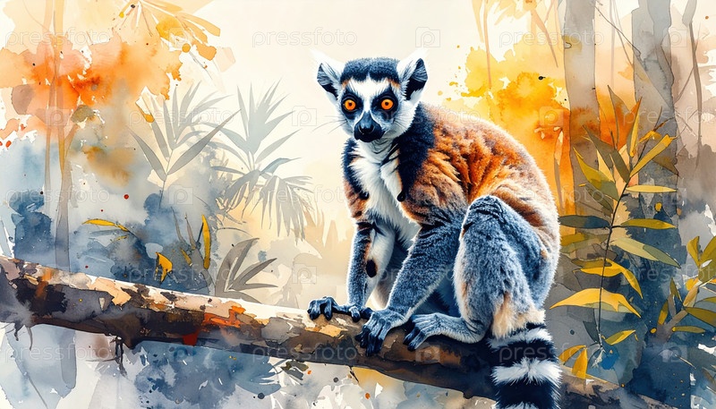 Кольцо хвостового лемура расположено на ветке в тропическом лесу, представляя дикую природу Мадагаскара, биоразнообразие и экзотические темы исследования природы