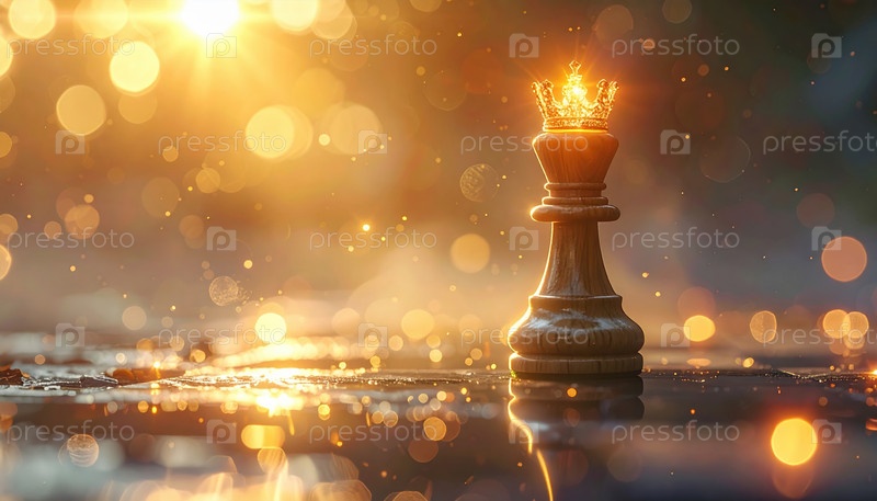 Шахматный король с золотой короной, светящейся на солнце, символизирует лидерство, власть, победу и стратегический успех в бизнесе и принятии решений