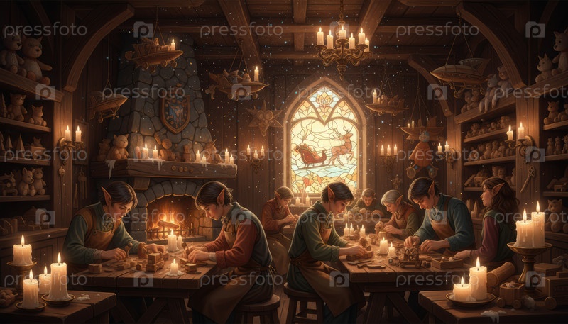 Эльфы создают деревянные игрушки в мастерской Санта-Клауса, символизируя командную работу, творчество и дух празднования в уютной зимней обстановке на Северном полюсе