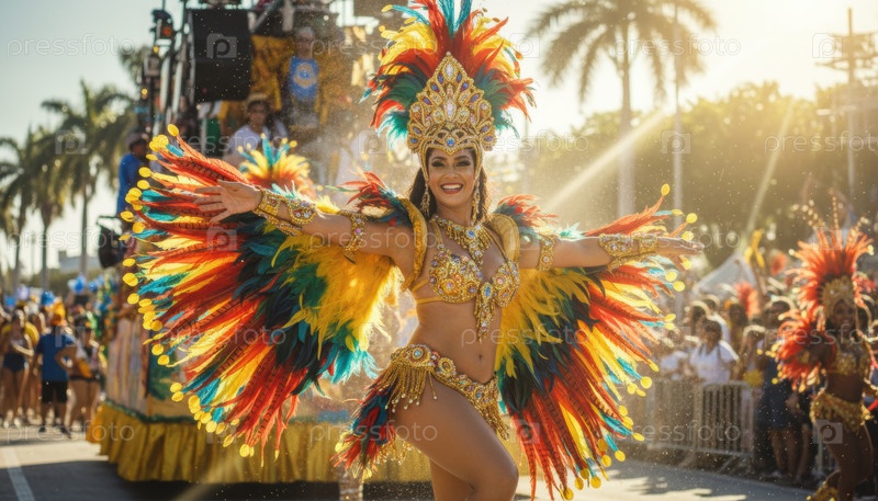 Танцовщица в красочном костюме празднует Карнавал Рио, символизирующий радость, свободу и глобальное культурное выражение через музыку и движения