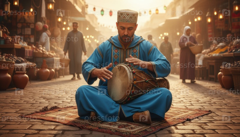 Мужчина в традиционном синем костюме играет на барабане на марокканском рынке при закате солнца, символизируя культурное выражение, музыку и связь через ритм и традицию