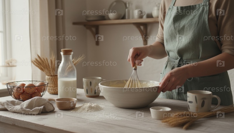 Женщина избивает тесто на деревенской кухне при естественном свете, представляя домашние выпечки, простоту, тепло и вечную связь между едой и комфортом