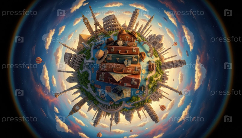 Креативная концепция путешествия с миниатюрным глобусом со знаменитыми достопримечательностями и складываемыми чемоданами, представляющими приключения по всему миру