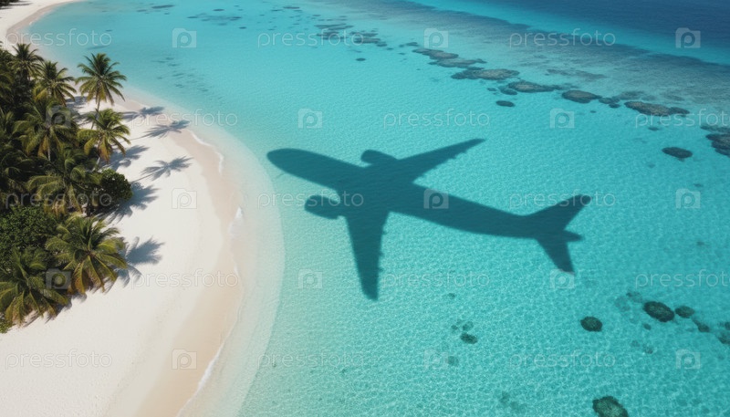 Тень самолета над бирюзовой лагуной вызывает страсть к странствиям и тропическим мечтам о дальних направлениях и экзотических каникулах