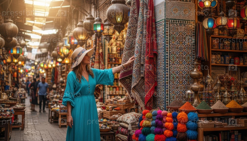Женщина исследует марокканский базар, наполненный фонарями, пряностями и коврами, представляющими культурную торговлю и яркие цвета путевых открытий