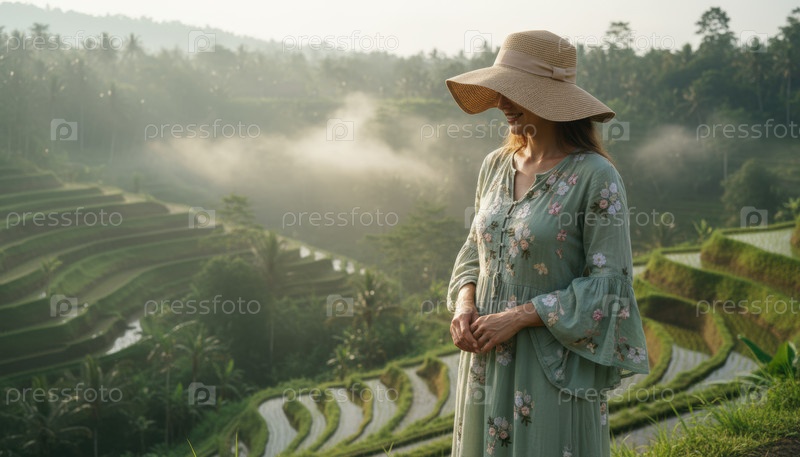Путешественник в зеленом платье восхищается Балийскими рисовыми террасами на рассвете, символизирующими спокойствие природы и медленный образ жизни