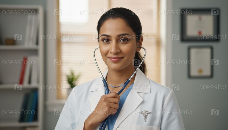 Уверенная женщина-врач в ярком медицинском кабинете, символизирующая здравоохранение, профессионализм и доверие к современной медицине