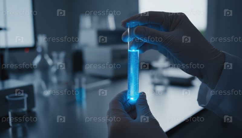 Ученый держит светящуюся синюю пробирку в лаборатории, представляющую научно-исследовательские инновации и медицинские открытия современной науки