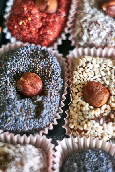 Подарочный набор сухофруктовых шоколадов с лезовыми орехами. ручной сырой десерт. селективный фокус