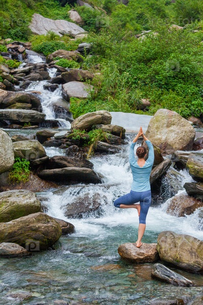 Женщина в хатха-йоге балансовая йога асана Врикшасан дерево позирует у водопада на открытом воздухе