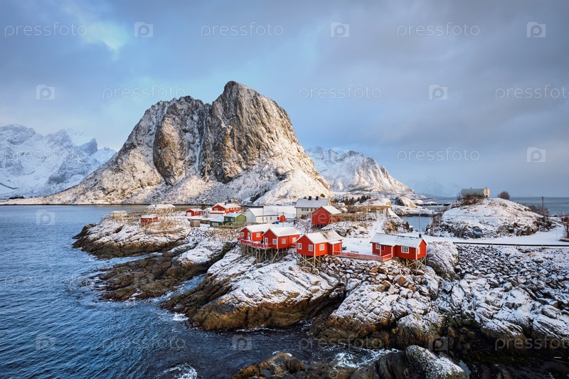 Известная туристическая достопримечательность рыбацкая деревня Хамна на Лофотенских островах, Норвегия с красными домами руербу зимой