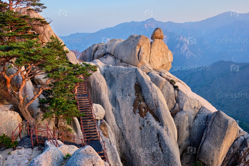 Вид на скалы и горные образования с вершины Ulsanbawi Rock при закате солнца со ступеньками