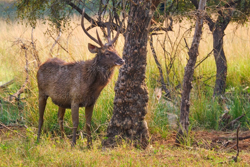 Мужской одноцветный олень Sambar Rusa в национальном парке Рантамбор, штат Раджастхан, Индия