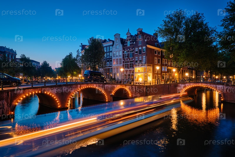 Амстердамский канал, мост и средневековые дома вечером
