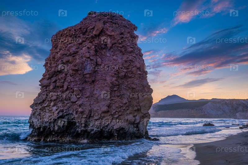 Пляж Фириплаки и волны Эгейского моря на закате, остров Милос, Киклады, Греция