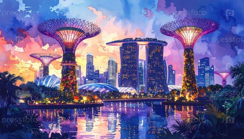 Футуристический горизонт Сингапурского залива Марина с освещенной рощи супер деревьев символизирует инновации, устойчивость и превосходство городского дизайна в современных городах