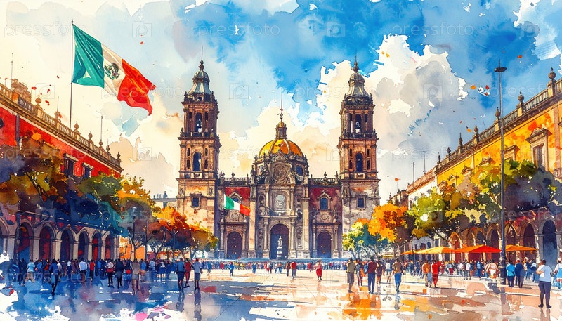 Акварельная сцена собора Мехико и площади Зокало с развевающимся флагом, живыми людьми и красочной городской атмосферой, отражающей национальную гордость и культуру