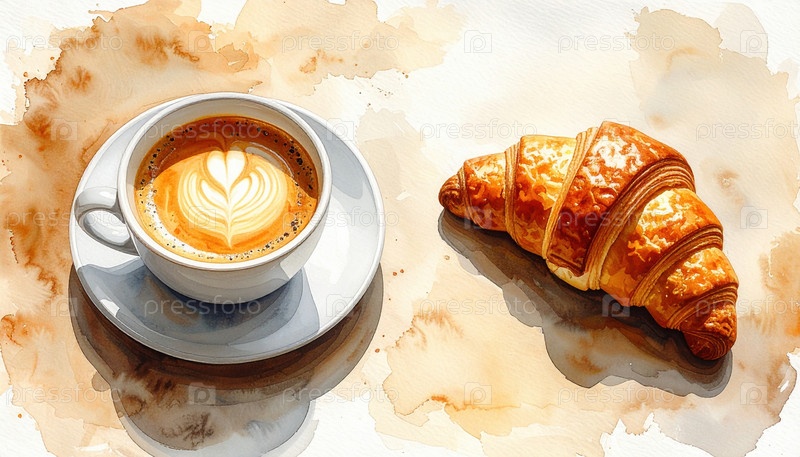 Чашка капучино с латте-артом рядом со золотым круасаном, вызывающая теплое уютное утро и европейскую культуру кафе